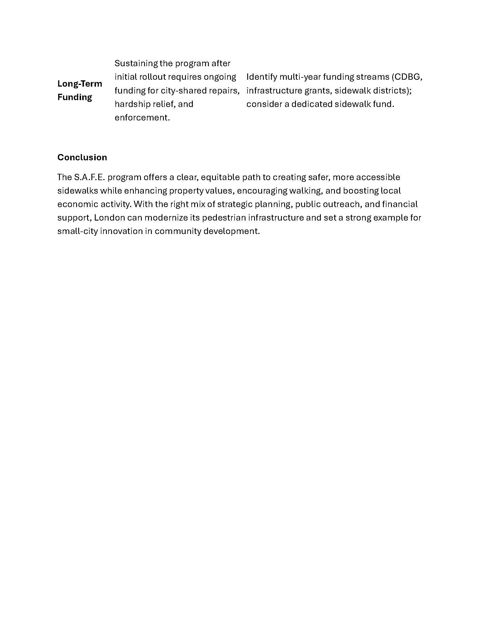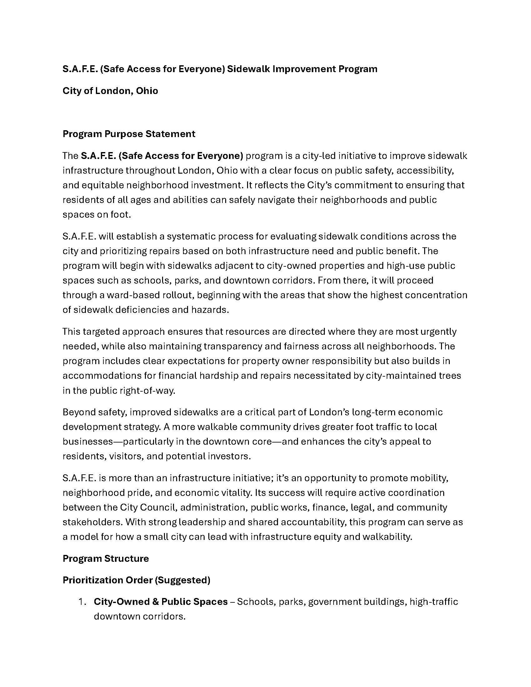 The S.A.F.E. Program is a London City Council initiative focused on upgrading sidewalk infrastructure with a commitment to public safety, accessibility, and equitable investment in all neighborhoods. Its goal is to ensure residents of all ages and abilities can move safely through their communities.
